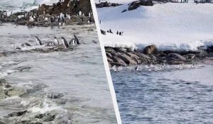 Scienziati registrano pinguini che saltano dall’acqua verso la terraferma