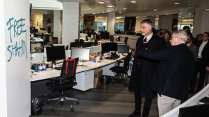 Alessandro Giuli visita La Stampa dopo l’aggressione dei manifestanti Pro Pal