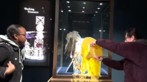 Manifestanti lanciano mele e budino sul vetrino dei Gioielli Reali a Londra, polizia arresta quattro