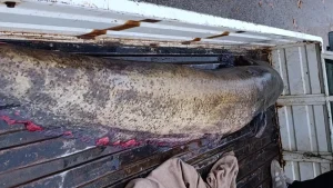 Pesce di 65 kg catturato a Iznik: quattro persone caricano con difficoltà il pesce gigante